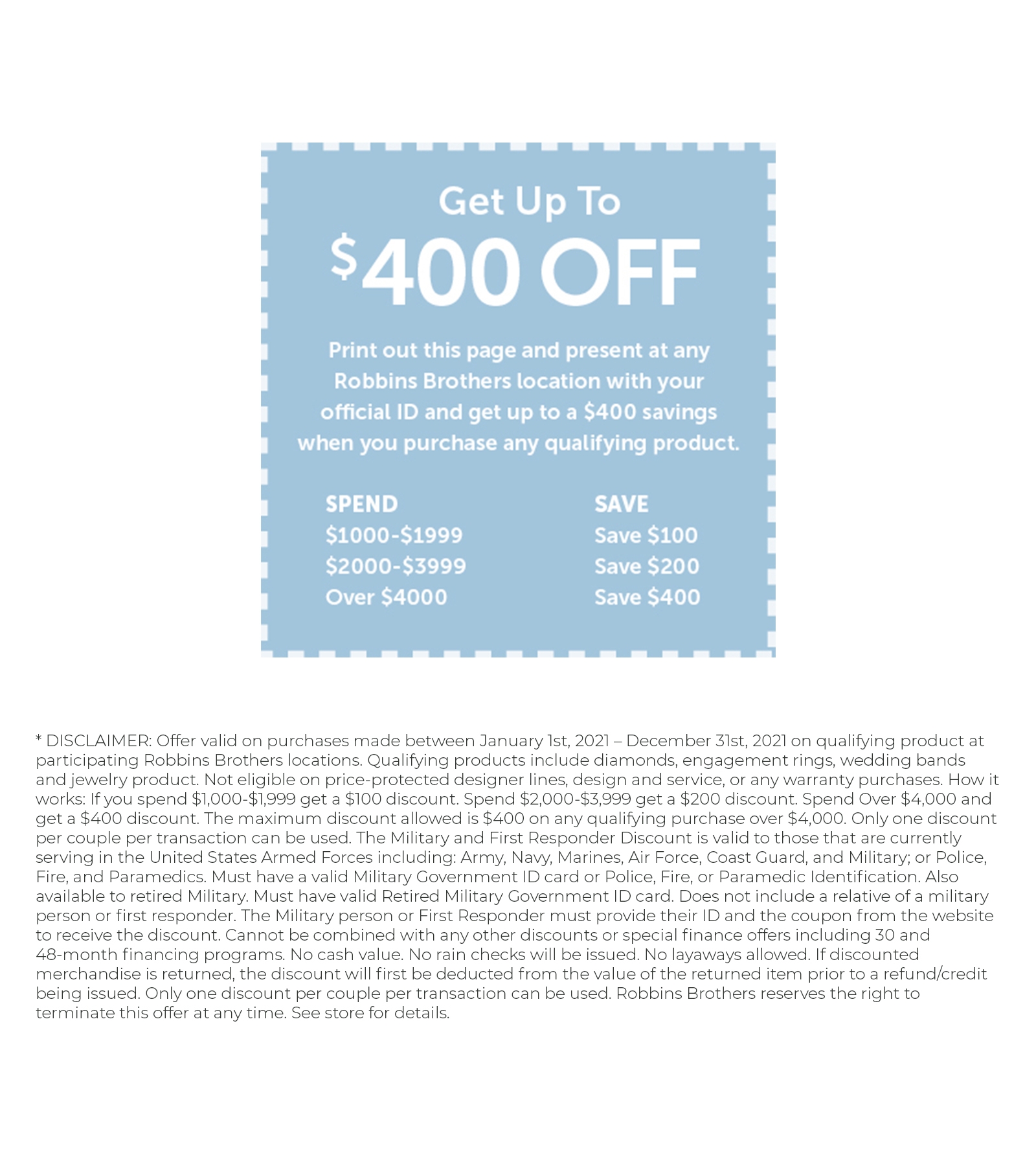 * Offer valid on purchases made between January 1st, 2021 – December 31st, 2021 on qualifying product at participating Robbins Brothers locations. Qualifying products include diamonds, engagement rings, wedding bands and jewelry product. Not eligible on price-protected designer lines, design and service, or any warranty purchases. How it works: If you spend $1,000-$1,999 get a $100 discount. Spend $2,000-$3,999 get a $200 discount. Spend Over $4,000 and get a $400 discount. The maximum discount allowed is $400 on any qualifying purchase over $4,000. Only one discount per couple per transaction can be used. The Military and First Responder Discount is valid to those that are currently serving in the United States Armed Forces including: Army, Navy, Marines, Air Force, Coast Guard, and Military; or Police, Fire, and Paramedics. Must have a valid Military Government ID card or Police, Fire, or Paramedic Identification. Also available to retired Military. Must have valid Retired Military Government ID card. Does not include a relative of a military person or first responder. The Military person or First Responder must provide their ID and the coupon from the website to receive the discount. Cannot be combined with any other discounts or special finance offers including 30 and 48-month financing programs. No cash value. No rain checks will be issued. No layaways allowed. If discounted merchandise is returned, the discount will first be deducted from the value of the returned item prior to a refund/credit being issued. Only one discount per couple per transaction can be used. Robbins Brothers reserves the right to terminate this offer at any time. See store for details.